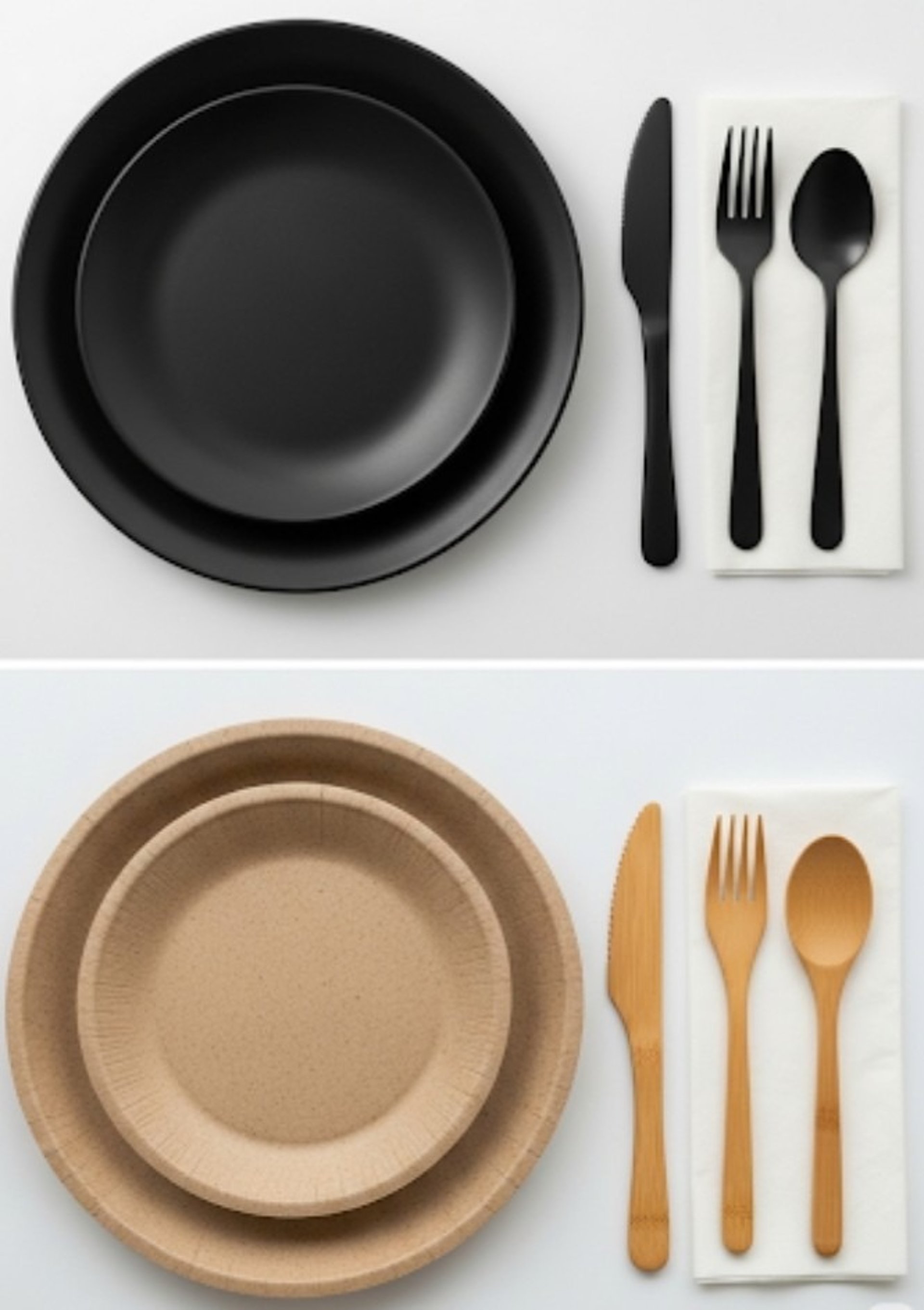 Premium quality black plates, heavy duty cutlery packs individually wrapped and napkins, serving tongs/spoons.