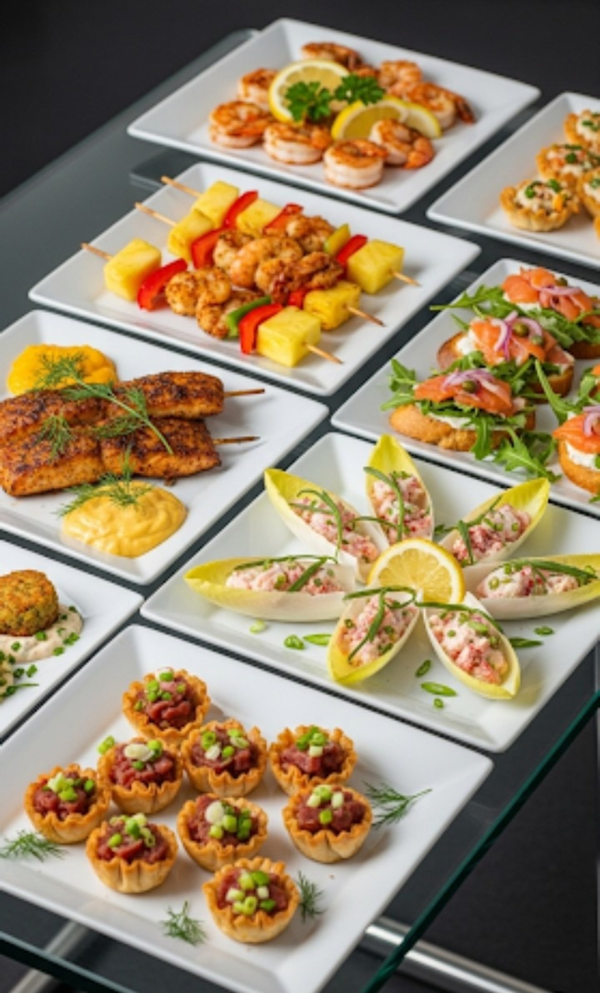 This is our selection of fresh seafood appetizers. Wonderful flavours, presented artfully. Priced at $4 per piece. Bulk discount for 100+ pieces.